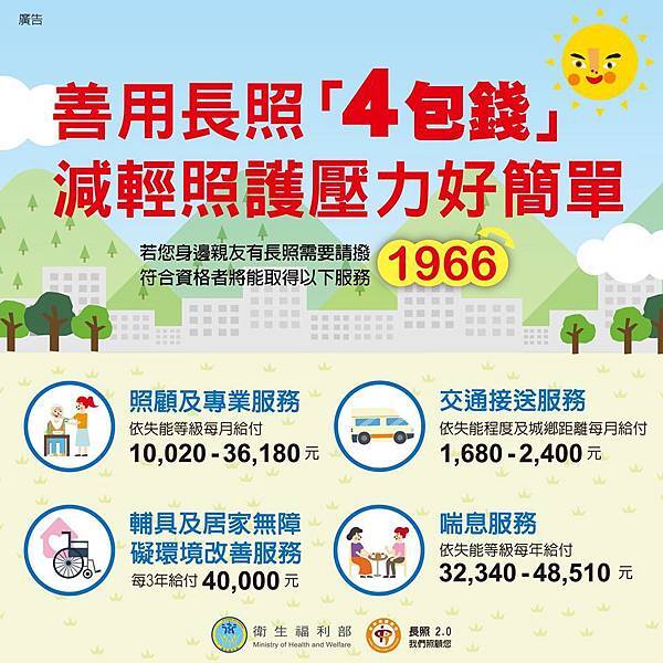 😄政府為減輕家庭照顧者的負擔,衛生福利部去年推出「長照四包錢」政策,也就是長照2.0中的「照顧及專業服務」、「交通接送服務」、「輔具服務及台南居家無障礙環境改善服務」、「喘息服務」等4項補助,